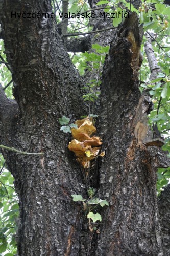 | Sírovec žlutooranžový - plodnice (14. června 2011) V sadě u Ballnerovy hvězdárny v horní části kmene staré třešně obecné (Prunus avium) každoročně vyrůstají plodnice jedlé dřevokazné houby sírovce žlutooranžového (Laetiporus sulphureus), který způsobuje tzv. hnědou hnilobu. V rozsoše mezi větvemi třešně roste kromě sírovce také malá borovice vejmutovka (Pinus strobus ) a kalina obecná (Viburnum opulus). |
