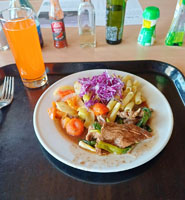 Po tomto dobrodružném výletu jednoho z členů už všichni zůstali na La Silla. Tam jejich pobyt zpříjemňovala výtečná kuchyně, která má tu nejlepší pověst zcela právem. Je o ní známé, že je mnohem lepší než kuchyně na sousední observatoři Las Campanas. „Snídaně probíhala ve formě švédských stolů. V kuchyni na objednání připravovali míchaná vajíčka (huevos revueltos) nebo volská oka (huevo frito) v požadovaném počtu. Zajímavostí je, že většina pečiva byla sladká, s výjimkou toustových chlebů. K obědu pak bylo na výběr obvykle z 5 až 6 druhů pokrmů, včetně vegetariánských variant. Samozřejmostí byly čerstvé ryby (např. losos). Kuchyně byla dost přizpůsobená Evropanům, takže klasický jihoamerický steak jsme zažili pouze dvakrát. K večeři bylo k dispozici podobné menu, počet druhů pokrmů byl nižší (obvykle 2-3). Večeře zůstávala k dispozici nočním pozorovatelům, takže bylo možné se zastavit na druhou večeři i kolem půlnoci. Bonusem k obědům a večeřím byl široký výběr zákusků, většinou připravovaných na místě,“ popisuje Jakub.