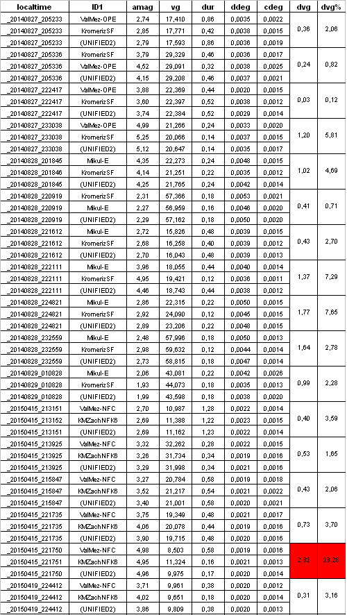 ID1 … stanice amag … absolutní magnituda meteoru vg … geocentrická rychlost (km/s) dur … trvání úkazu (meteoru) ddeg … astrometrie hvězdného pozadí (masky) záznamu cdeg … úhlová odchylka proložené přímky a skutečného záznamu meteoru