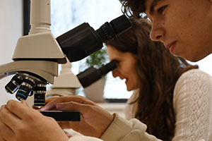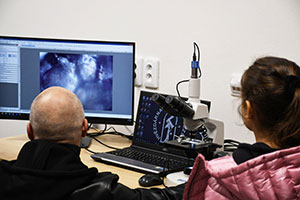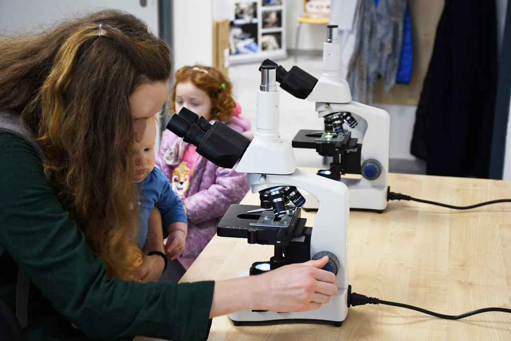 | Obr. 13: Návštěvníci zkoušejí mikroskopy. Autor: Hvězdárna Valašské Meziříčí, p.o. | Obr. 14: Přes naše mikroskopy se dá pozorovat i s počítačem. Autor: Hvězdárna Valašské Meziříčí, p.o. |