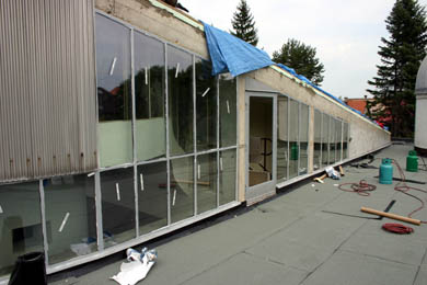Byly dokončeny základní vrstvy střešního pláště na nástavbě objektu (nad přednáškovým sálem), který už čeká jen na dodávku speciální vlnité krytiny. S tím souvisí dokončení nadpraží, jeho tepelná izolace a příprava pro klempířské prvky.