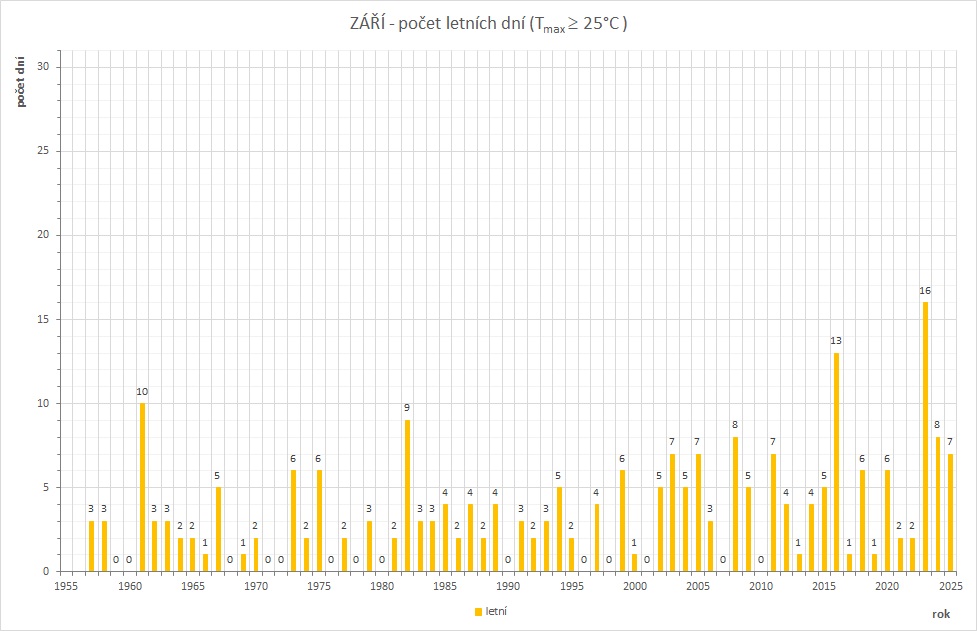 Letní dny jsou v září běžným jevem. Od počátku měření se vyskytlo 14 roků se zářím bez letního dne. Nejvíce letních dnů bylo v roce (2023) s počtem 16 dnů! Průměrný počet letních dnů od počátku měření vychází 3,2.