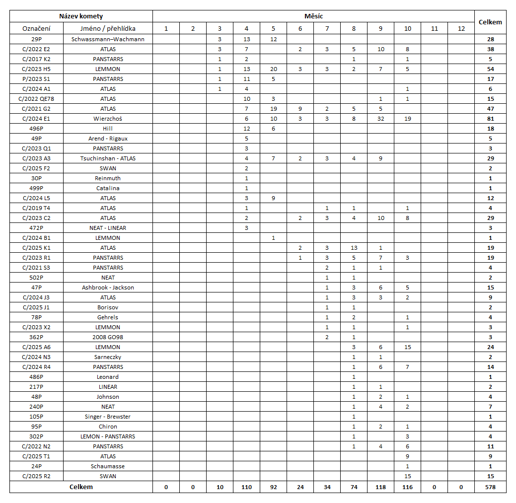 | Tab. 1: Přehled počtu fotometrických měření jasnosti komet v roce 2025. Autor: Jakub Koukal |