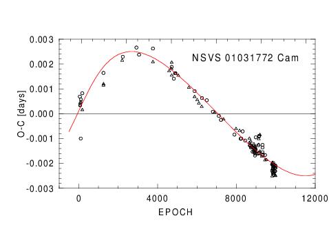 Po delší době jsme se vrátili k fotometrii NSVS 01031772 Cam, která také patří do programu sledování eruptivních hvězd. Tentokrát to ale nebylo z důvodů zachycení erupcí, ale získání primárního nebo sekundárního minima. Na základě analýzy O-C diagramu docentem Wolfem z astronomického ústavu UK se předpokládá, že kolem aktivní dvojhvězdy se nachází třetí hvězda. Původní perioda oběhu třetí hvězdy vycházela zhruba na 11 let, ale očekávaná změna v chodu O-C diagramu ještě nenastala. Perioda zřejmě bude delší. Podle archivních dat bylo první minimu zaznamenáno ve Valašském Meziříčí 8.7. 2013 (epocha 8219) a poslední 29.9. 2016 (epocha 11 422). Za dobu 1179 dní okamžik minima nastává o 4 minuty a 40 sekund dříve, což je sice změna malá, nicméně dobře změřitelná a novými pozorováními potvrzená.
