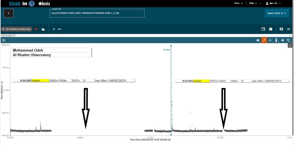 Světelná křivka TIC 347695698 pozorovaná družicí TESS v sektoru S91. Šipkou jsou označena místa, kdy byly pozorovány erupce z Al Khatim Observatory. Bohužel v těchto časech družice TESS data nepořizovala