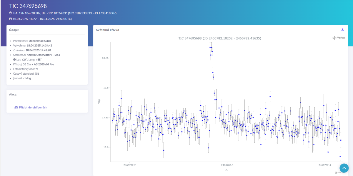 Světelná křivka erupce TIC 347695698 z 16. dubna 2025 ve filtru V Mohammadem Odehem z Al Khatim Observatory. Amplituda erupce byla 0,11 magnitudy a délka trvání byla 20,5 minuty.