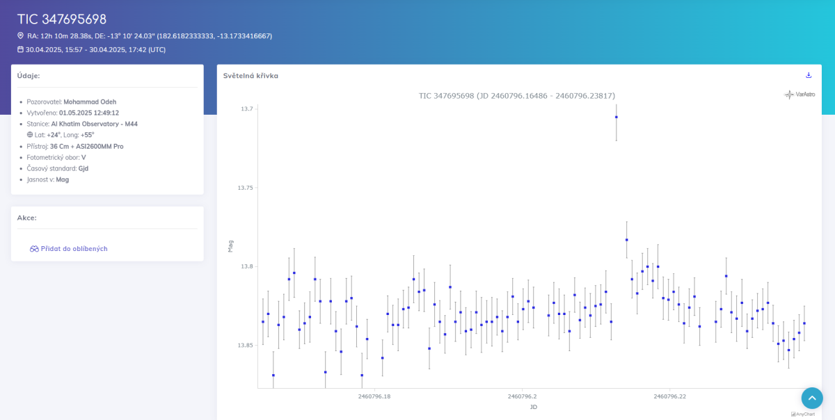 Světelná křivka erupce TIC 347695698 z 30. dubna 2025 ve filtru V Mohammadem Odehem z Al Khatim Observatory. Amplituda erupce byla 0,12 magnitudy a délka trvání byla 12,2 minuty.