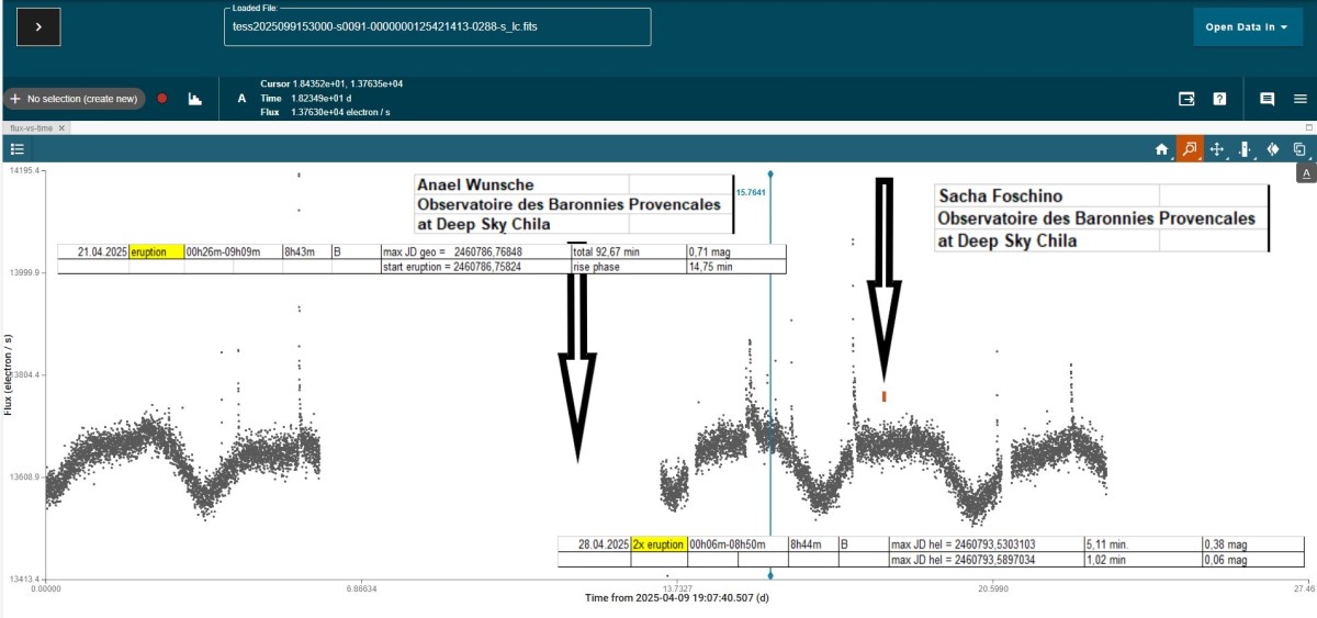 Jak jsme informovali v přehledu pozorování za duben, květen 2025, probíhala kampaň, kdy byly pozorovány eruptivní hvězdy TIC 98751019, 347695698 a 125421413 jednak družicí TESS během sektoru č. 91 a jednak pozemskými přístroji. Souběžnou fotometrii těchto hvězd vyhlásila skupina astronomů z astronomického oddělení univerzity Wroclaw pod vedením Kamila Bicze. Cílem těchto pozorování je potvrzení nové teorie, která z barevné fotometrie erupcí je schopna určit průběh teploty aktivní oblasti.