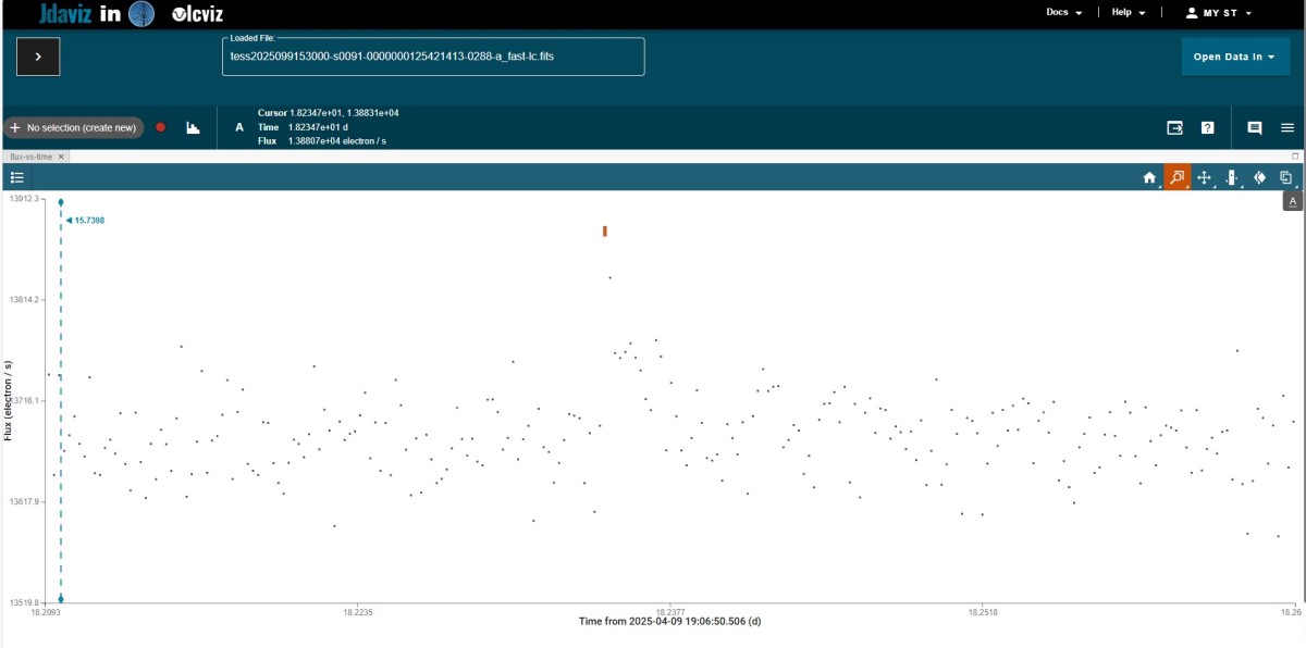 Světelná křivka hvězdy TIC 125421413 z pozorování družice TESS v sektoru S 91. Oranžový obdélník označuje maximum erupce pozorované 28.4. 2025 souběžně ze Země ve filtru B a družicí TESS. Amplituda zjasnění erupce z dat TESS je 0,01 magnitudy a trvala cca 5 minut. Celkem bylo na světelné křivce detekováno 22 erupcí. Modulace světelné křivky bez erupcí odpovídá rotační periodě červeného trpaslíka 3,334 dne.