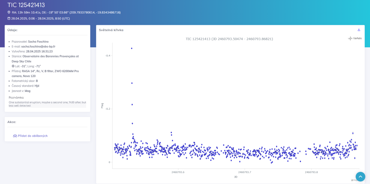 Světelná křivka TIC 125421413 pořízená Sacha Foschino na Observatoire des Baronnies Provencales at Deep Sky Chila 28.4. 2025 ve filtru B s amplitudou 0,38 magnitudy trvající 5 minut. Po několika minutách nastala ještě jedna slabší erupce, ta ale v datech družice TESS zanikla v šumu dat.