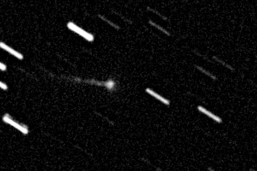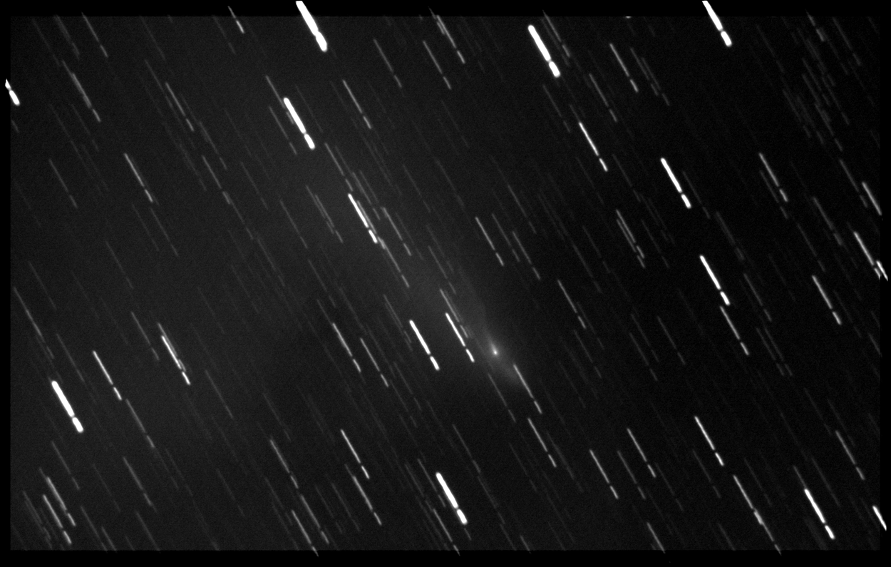O tři dny později bylo zase všechno jinak. Rozštěpení primární kondenzace na dvojici samostatných částí, je již viditelné i na nijak neupraveném záběru. Po odečtení mediánové masky je zřejmé. I když použitá expozice byla kratší, dajší úlomky jádra v ohonu se opět pozorovat nepodařilo.
