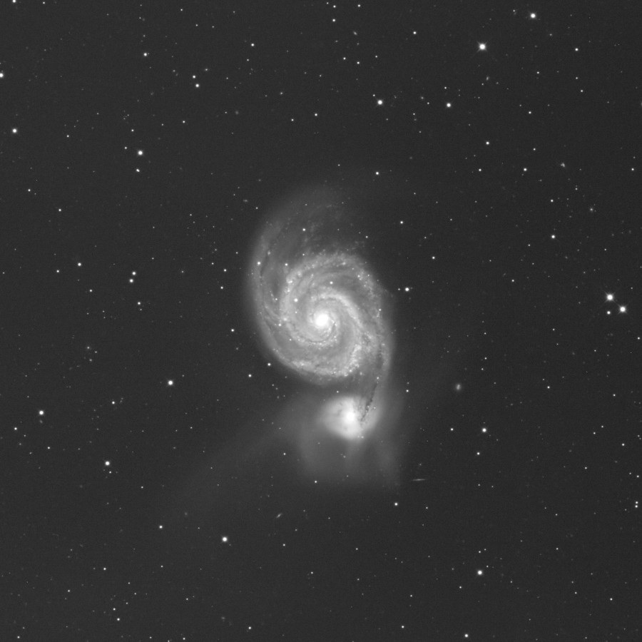 M51 (NGC 5194) známá také jako Vírová galaxie (The Whirlpool Galaxy), je krásná spirální galaxie nacházející se v souhvězdí Honících psů (Canes Venatici), ve vzdálenosti přibližně 23 milionů světelných let od Země. Je jedním z nejúchvatnějších příkladů spirální galaxie s výraznými rameny a jasným jádrem. M51 je ve vzájemné gravitační interakci s menší galaxií NGC 5195, která se nachází na konci jednoho z jejích spirálních ramen, což přispívá k jejímu výraznému tvaru. Pro pozorovatele z České republiky je M51 nejlépe viditelná v jarních měsících, kdy se nachází vysoko nad obzorem. Za tmavé noci ji lze spatřit i menším dalekohledem jako mlhavou skvrnu, větší dalekohledy pak odhalí její spirální strukturu v plné kráse (Obr. 1).