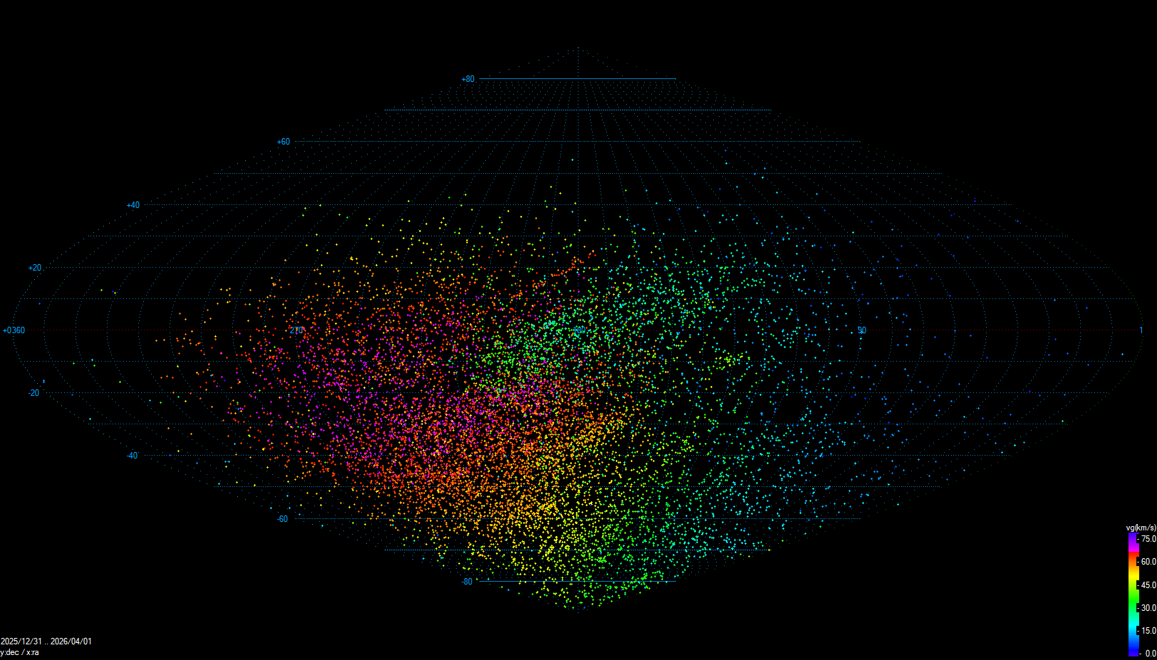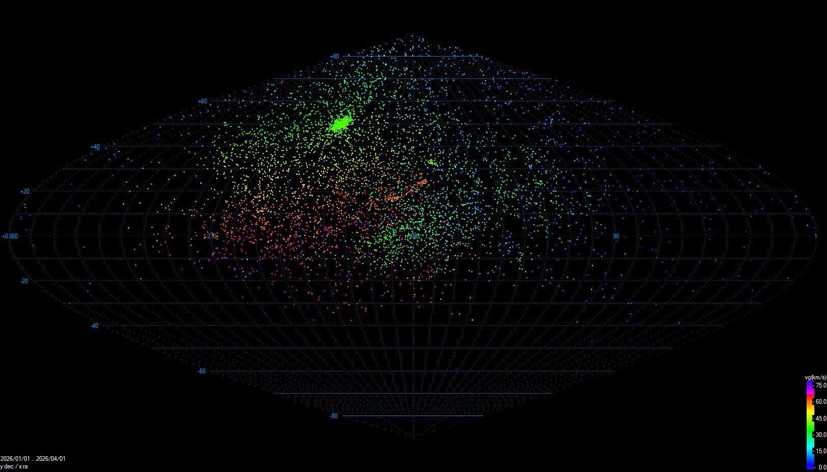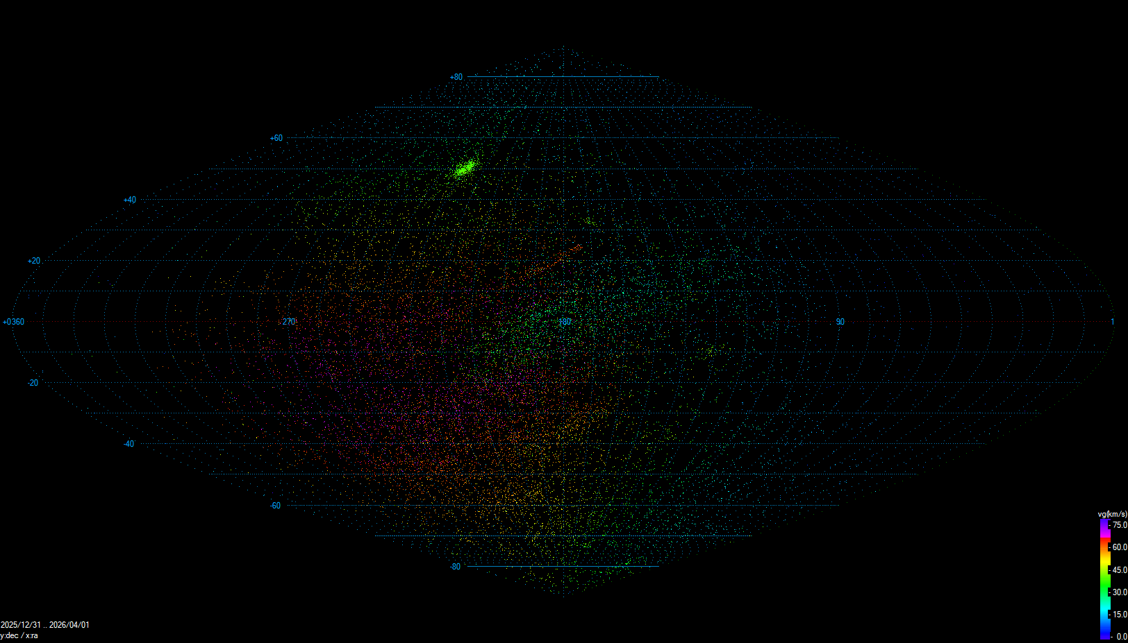 Nejvíce vícestaničních drah v rámci sítí CEMeNt a SSOVMO patří ke sporadickému pozadí (14 845 drah), následuje meteorický roj Quadrantid (QUA, 384 drah, Obr. 8), Comae Berenicid (COM, 35 drah), omicron Hydrid (OHY, 33 drah), kappa Virginid (KVI, 31 drah), lednových xi Ursae Majorid (XUM, 26 drah, Obr. 9) a pak následují další slabší meteorické roje, jejichž počet vícestaničních drah byl nižší než 20 drah. Počet jednostaničních meteorů (stejně jako vícestaničnch drah) ve všech měsících 1. čtvrtletí 2026 je historicky vůbec nejvyšší v rámci sítě CEMeNt za celou dobu její existence od roku 2009.
