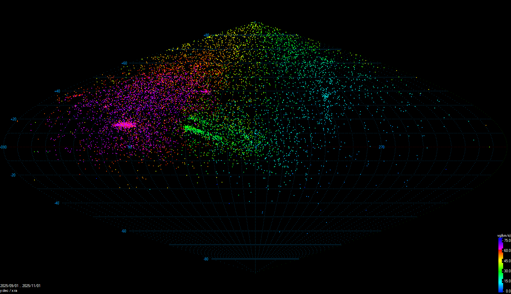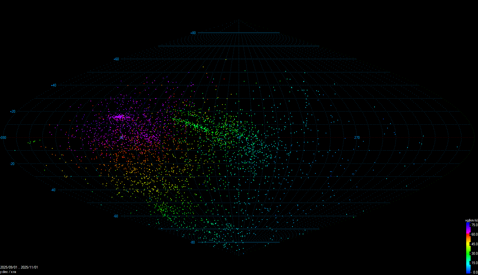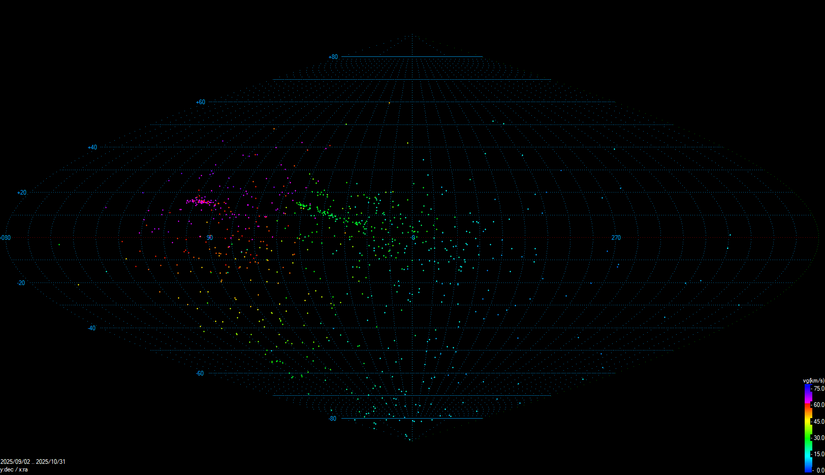 Na začátku měsíce září doznívá aktivita meteorického roje Aurigid (AUR), jejichž maximum nastalo podle grafu vizuální aktivity IMO VMDB (International Meteor Organization Visual Meteor Database) 1. 9. 2025 ráno (2:05 UT) a maximální korigovaná hodinová frekvence Aurigid dosáhla v letošním roce 11,6 ± 1,8 meteorů. Maximum meteorického roje zářijových epsilon Perseid (SPE) nebylo vizuálně monitorováno, nejvyšší korigovaná hodinová frekvence dosáhla 8,0 ± 2,3 meteorů ve večerních hodinách 16. 9. 2025 (21:34 UT). Meteorický roj je známý svou nepravidelnou aktivitou, která v některých letech vykazuje krátká zvýšení aktivity, tzv. outbursty (např. v roce 2013). Na konci měsíce se pak začala projevovat aktivita komplexu komety 2P/Encke, zaznamenány byly dráhy meteorů patřících k meteorickým rojům nu Piscid (NPS) a severních (NPI) a jižních delta Piscid (SPI). Na tyto roje pak v říjnu navazuje aktivita hlavního meteorického roje komplexu komety 2P/Encke, jímž jsou Tauridy. Tento meteorický roj známý jasnými bolidy se rovněž dělí na severní (NTA) a jižní (STA) větev.