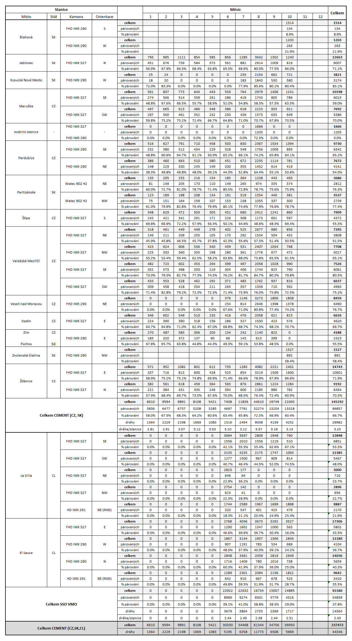 | Tab. 1: Přehled počtu zaznamenaných a párovaných meteorů v roce 2025 na stanicích sítě CEMeNt a SSOVMO. Autor: Jakub Koukal, Alexandra Mikušková |