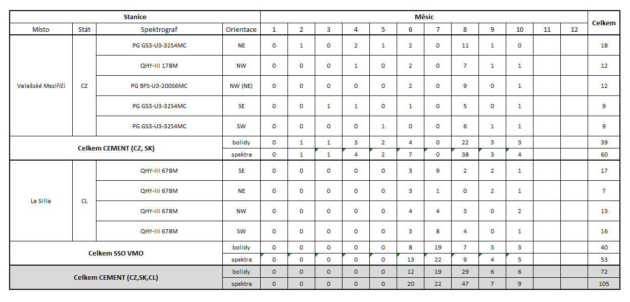 V říjnu 2025 bylo kamerami sítě CEMeNt (Central European Meteor Network) a SSO VMO (Southern Spectroscopic Observatory of the Valašské Meziříčí Observatory) zaznamenáno 36 950 jednostaničních meteorů, jejichž kombinací vzniklo 5 969 vícestaničních drah. Kamery sítě CEMeNt zaznamenaly 22 065 jednostaničních meteorů, jejichž kombinací vzniklo 4 252 vícestaničních drah (Obr. 3 a 4), kamery sítě SSO VMO zaznamenaly 14 885 jednostaničních meteorů, jejichž kombinací vzniklo 1 717 vícestaničních drah (Obr. 5-8). K dnešnímu datu nejsou do zpracování zahrnuta pozorování ze stanic z vnějšího perimetru sítě, a to z Rokycan (CZ), Plzně (CZ), Karlových Varů (CZ), Blahové (SK) a Zvolenské Slatiny (SK), jejichž zpracování není dokončeno.