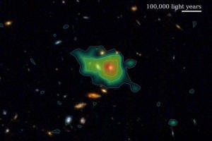 Obrovské halo plynného vodíku bylo nalezeno v datech z experimentu s temnou energií Hobby-Eberly Telescope Dark Energy Experiment (HETDEX) a překryté jeho polohou, jak je vidět na hloubkovém snímkování z vesmírného dalekohledu Jamese Webba (JWST). Tento systém, který existoval před 11,3 miliardami let, září kombinovaným světlem mnoha galaxií v něm obsažených, přičemž nejjasnější oblast je znázorněna červeně. Pomocí dat z experimentu HETDEX astronomové zvýšili známý počet těchto halo více než desetkrát – ze zhruba 3 000 na více než 33 000.