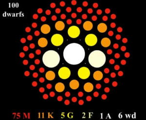 Tato grafika pomáhá ilustrovat trpasličí hvězdy do 10 parseků od Slunce. Zobrazuje počet jednotlivých typů hvězd na každých 100 hvězd v okolí. Hvězdy typu K jsou druhým nejpočetnějším typem, přesto jsou v průzkumech exoplanet nedostatečně zastoupeny.