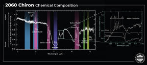 Na připojeném spektru z Webbova teleskopu je chemické složení Chirona. Barevné pruhy zvýrazňují různé druhy ledu, jako je vodní led, oxidy uhlíku a lehké uhlovodíky. Vložený obrázek vpravo je detail odrazivosti Chirona zvýrazňující fluorescenci metanu spolu s absorpcí etanu a propanu.