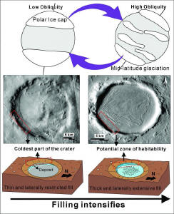 Přitom se zjistilo, že led v těchto kráterech se soustavně hromadil na stinných jihozápadních stěnách. Navíc to platilo po celou dobu několika ledových dob v amazonském období (Amazonian period) přibližně před 640 až 98 miliony let. Trishit Ruj v tiskové zprávě Okayama University uvedl: Mars prošel opakovanými ledovými dobami, ale množství ledu uloženého v kráterech se v průběhu času postupně zmenšovalo. Tyto ledové „časové kapsle“ nejen odhalují, jak Mars přišel o svou vodu, ale také označují místa, kde by budoucí průzkumníci mohli těžit skryté zdroje ledu.