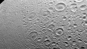 Severní pól Saturnova měsíce Enceladus vykazuje významný tepelný tok, což vyvrací předchozí předpoklady, že tepelné ztráty jsou omezeny na jeho geologicky aktivní jižní pól. Severní pól Enceladu je na obrázku nahoře a snímek je otočen o 38 stupňů doleva. Fotografie byla pořízena ve viditelném světle úzkoúhlou kamerou kosmické sondy Cassini 27. listopadu 2016.
