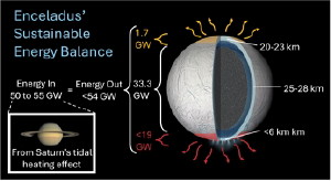 Tento podpovrchový oceán však může podporovat život pouze tehdy, pokud má stabilní prostředí, přičemž ztráty a zisky energie jsou v rovnováze. Tato rovnováha je udržována slapovým ohřevem: Saturnova gravitace natahuje a stlačuje Enceladus, když obíhá kolem planety, a vytváří tak teplo uvnitř. Pokud by Enceladus nezískal dostatek energie, jeho povrchová aktivita by se zpomalila nebo zastavila a oceán by nakonec mohl zamrznout. Příliš mnoho energie by naopak mohlo způsobit zvýšení oceánské aktivity, což by změnilo jeho prostředí.
