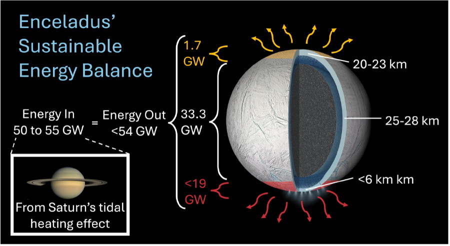 Nová studie omezila globální tok tepla vedením na Enceladu studiem sezónních teplotních výkyvů na jeho severním pólu (žlutě). Tyto výsledky v kombinaci s existujícími výsledky z jeho vysoce aktivní jižní polární oblasti (červeně) poskytují první pozorovací omezení pro výpočet energetických ztrát Enceladu (<54 GW) – což je v souladu s předpokládaným energetickým vstupem (50 až 55 GW) ze slapového ohřevu. To naznačuje, že současná aktivita Enceladu je dlouhodobě udržitelná – což je důležitý předpoklad pro vývoj života, jehož existence v jeho globálním podpovrchovém oceánu je pravděpodobně možná.