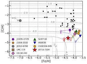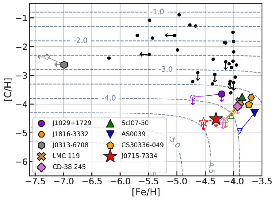 Na publikovaném obrázku je logaritmický graf znázorňující hvězdy s nízkou metalicitou podle jejich obsahu uhlíku v porovnání s obsahem železa. Hvězda SDSS J0715-7334 (na grafu znázorněna červenou hvězdičkou) má nejnižší hodnoty obou prvků.