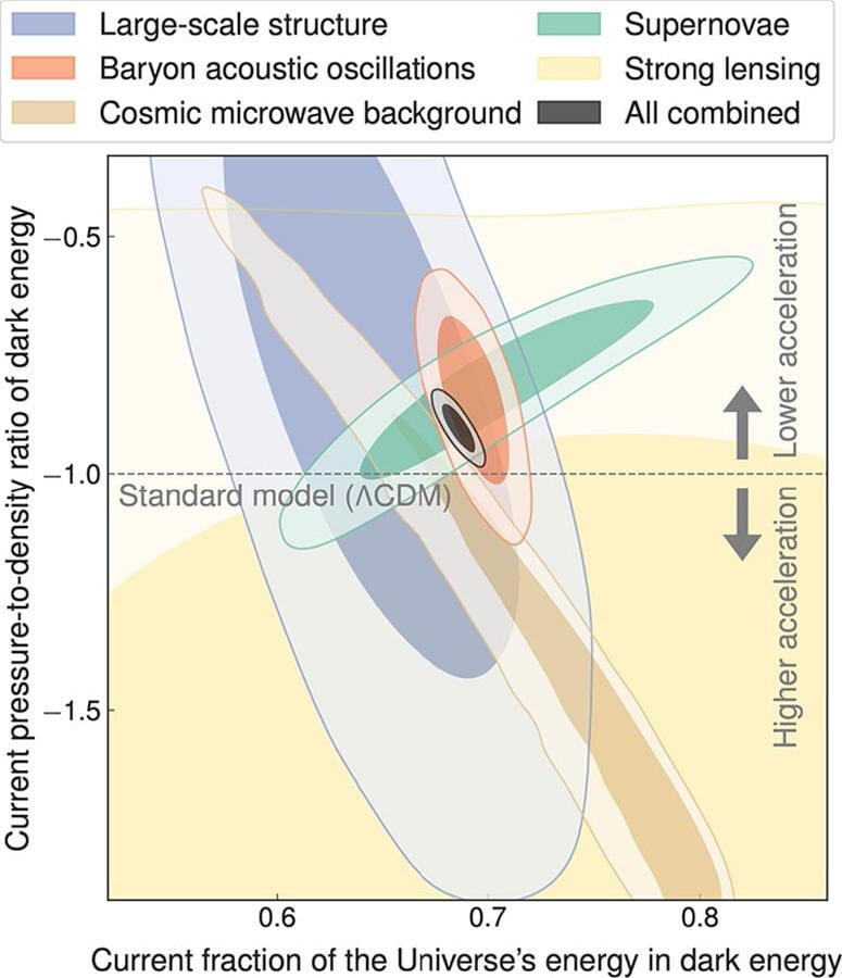 Tato kombinace datových sad naznačila silný rozpor se standardním modelem temné energie, který se nevyvíjí. Zajímavou vlastností nevyvíjející se temné energie je, že její hustota zůstává v čase konstantní, i když se prostor rozpíná. U modelu vyvíjející se temné energie se však hustota temné energie s časem mění.