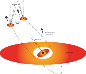 Tým navíc identifikoval nový druh výtrysků vycházejících ze sekundární černé díry, které mají zřejmě zkroucený, hadovitý profil. To je způsobeno tím, jak sekundární černá díra rychle obíhá kolem primárního objektu OJ287, což způsobuje, že se její výtrysky odklání v závislosti na jejím pohybu. Podle týmu budoucí pozorování ukážou, jak se tato výtrysky kroutí různými směry, když se rychlost a směr sekundární černé díry změní ve vztahu k její oběžné dráze.