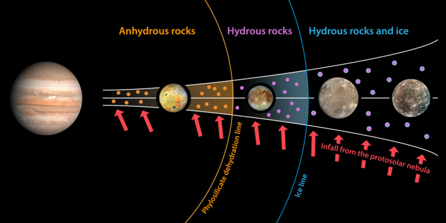 Diagram znázorňuje rozdílné výchozí materiály pro vznik galileovských měsíců, přičemž Io vznikal z bezvodé horniny, Europa vznikala z vodnaté (na vodu bohaté) horniny, zatímco Ganymed a Kallisto se formovaly primárně z ledu.