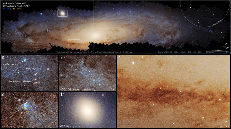 Jedná se o největší fotomozaiku, jakou kdy HST vytvořil. Zajímavé oblasti zahrnují: (a) shluky jasných modrých hvězd uvnitř galaxie, galaxie v pozadí, které jsou vidět mnohem dále a fotografie několika jasných hvězd v popředí, které se ve skutečnosti nacházejí uvnitř Mléčné dráhy; (b) NGC 206 – nejnápadnější hvězdný oblak v Andromedě; (c) mladá hvězdokupa modrých nově narozených hvězd; (d) satelitní galaxie M32, která může být zbytkovým jádrem galaxie, která se kdysi srazila s Andromedou; (e) tmavé prachové pruhy přes nesčetné množství hvězd.