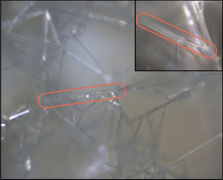Vpravo je přiložen mikroskopický snímek krystalů HCN s 10× (celý snímek) a 50× (vložený obrázek vpravo nahoře) zvětšením. HCN krystalizuje do jehliček s vysokým poměrem stran (dvě jsou zvýrazněny červeně), které tvoří pavučinovou konektivitu.