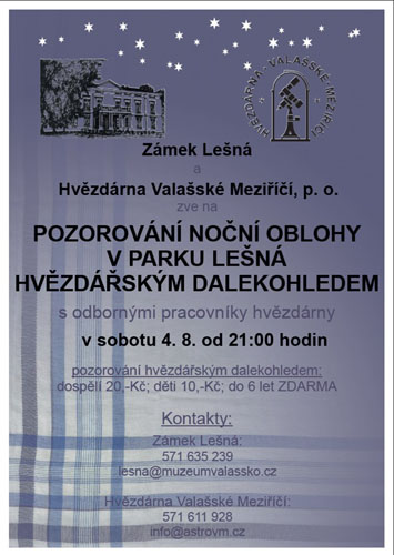 Hvězdárna Valašské Meziříčí, p.o. ve spolupráci se Zámkem Lešná pořádá v sobotu 4. srpna 2012 ve 21:00 hodin