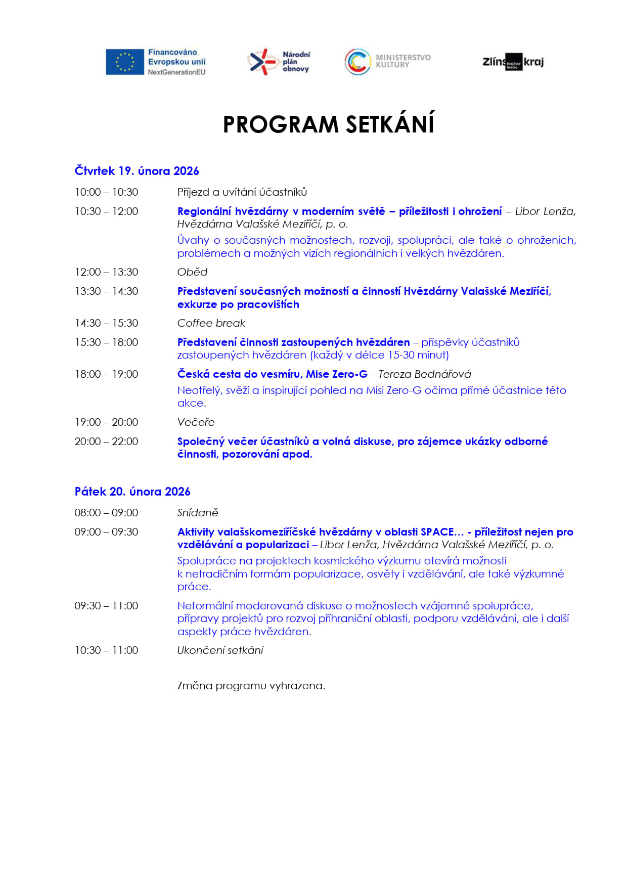 Prosíme účastníky, aby se předem závazně přihlásili na emailové adrese nlenzova@astrovm.cz, a to nejpozději do 13. února. 2026, abychom mohli zajistit vše potřebné.