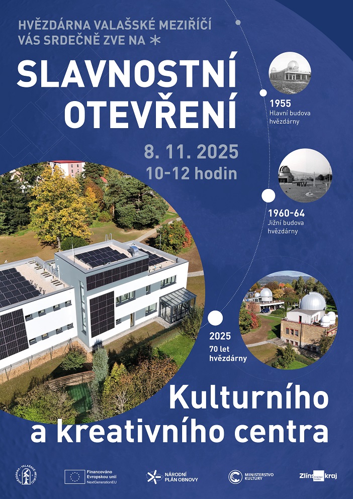 Hvězdárna Valašské Meziříčí, p. o. Vás srdečně zve na slavnostní otevření Kulturního a kreativního centra, které se koná v sobotu 8. listopadu 2025 od 10 do 12 hodin. Při této příležitosti si připomeneme i 70. výroční otevření valašskomeziříčské hvězdáry pro veřejnost.